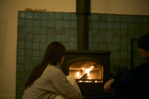 凍える空気から戻ると、薪ストーブのやさしく深い温もりが頬に残る冷たさを緩やかに解いていく。